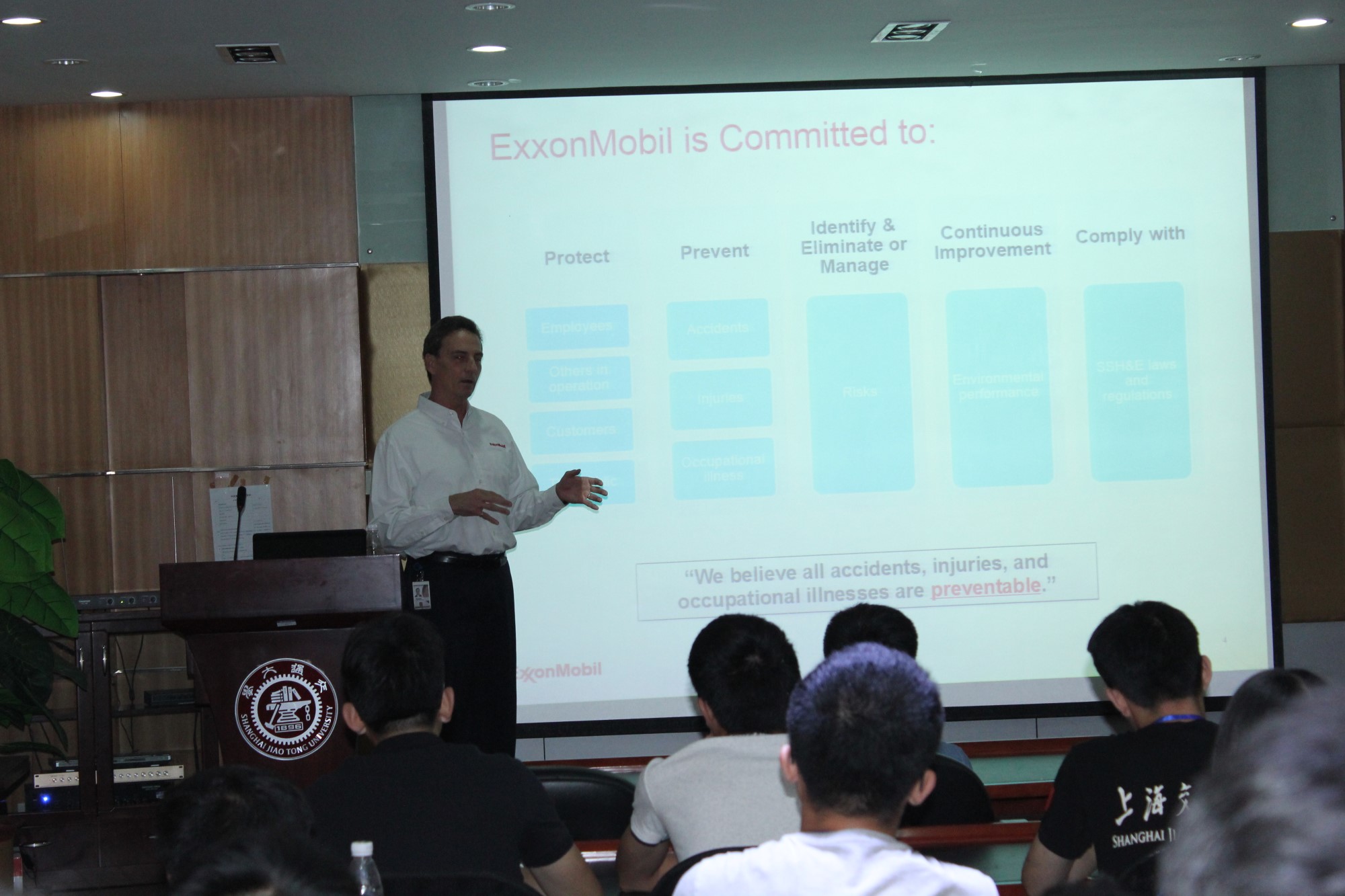 下午1点,研发部主管Robert Wittenbrink先生在五楼演讲厅为学生和学院部分安全员做了 “Safety Management at ExxonMobil” 的专题报告。他的演讲严肃而又风趣,与会同学积极互动,针对日常化学实验遇到的问题,他一一作了解答。