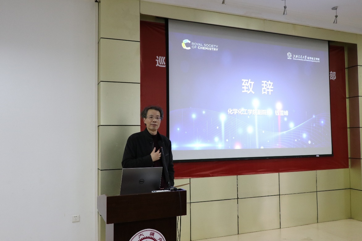 活动开始,首先由钱雪峰老师致辞。钱院长自豪的向大家介绍了化院近期的巨大成就,指出化工学院正处于新的发展机遇之下,钱院长通过回忆化院的发展历史,指出化院发展蒸蒸日上,在人才方面有巨大突破,这给同学们提供了很好的平台。最后,钱院长感谢了RSC对本次活动支持,并希望同学们日后更加积极地参与学术活动。