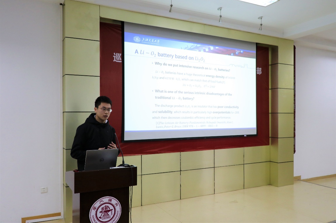 第一组进入汇报,由张振同学介绍项目——“基于超氧化锂的锂空气电池”, 张振同学详细介绍了自己课题组对锂电池的研究和项目获得的成就。汇报结束后,钱雪峰院长、张怡凡老师和尹屹梅老师对张振同学的项目提出宝贵的建议。