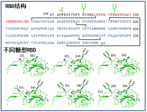 S-RBD由219个氨基酸组成(R319-K537),含有两个保守的N型糖基化位点(N331, N343)以及部分可能的O型糖基化位点(如T323),通过四对二硫键形成相应的三级结构。不同的生物表达体系以及人体内分离的病毒S蛋白上,糖链的结构均异常复杂。其中N331与N343主要由复杂型糖链构成,同时N331位点也有部分由N型糖链的核心五糖构成。相较于表达体系,化学合成糖蛋白具有精确的糖链结构,但其受限于冗长的合成路线。
