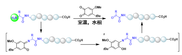 蛋白质的定点修饰是通过化学反应对蛋白质特定位点进行修饰,从而达到对蛋白质改性或对其进行标记等一系列目的。蛋白质的定点修饰对反应条件严格:反应需要在水相溶液中进行,同时蛋白质其他侧链基团不参与反应。社团学姐漫画 王平特别研究员课题组一直以来致力于蛋白质,多肽的化学合成与修饰。近日,该课题组与中国科学院昆明动物研究所郑永唐研究员课题组合作,发展了一种由仿生的邻醌介导对蛋白N-端进行选择性修饰的方法,并成功将其运用于蛋白质标记,抗HIV药物筛选等领域。[1]