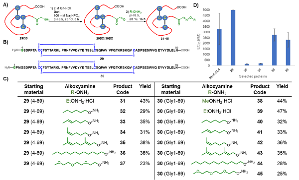 蛋白质趋化因子CCL4是HIV辅助受体CCR5的配体。作者利用该策略对CCL4的 N-端进行转胺化修饰,快速得到了一系列修饰蛋白质29-45。抗HIV-1活性体外实验表明,带修饰蛋白质30和31的抗HIV-1活性相较于表达的CCL4活性有显著提高。该实验表明,通过蛋白质化学合成与定点修饰联用可以在短时间内得到大量不同修饰的蛋白质,这在很大程度上为抗HIV蛋白质类药物的制备提供了技术手段。