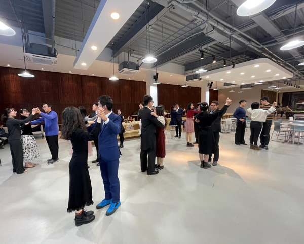 伴着歌声的余韵,成员们在国标舞协会陈利华和周勍同学的指导下步入舞池,开始学习交谊舞会的舞蹈礼仪。两位指导同学耐心地从步法、姿势、搭手动作等方面向在场成员们展示交谊舞的基本动作,成员们虚心学习并与舞伴不断尝试,伴随着华尔兹圆舞曲的优美旋律,展现出了名材班成员的优美舞步与自信风度。