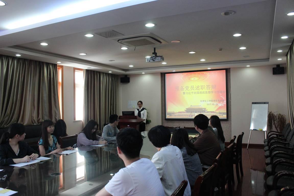 在党员发展工作中严格标准、严格培养、严格程序的一个重要环节。为推进“两学一做”学习教育常态化,5月24日下午,化院预备党员述职答辩暨习近平治国理政思想学习交流会在化学楼5楼会议室举行。学院关工委张斌老师、院学生党建工作负责人李安英老师、院党建联席会主席王雯、副主席章露枝和各党支书出席并担任评委,共有本硕博16名预备党员参加答辩。