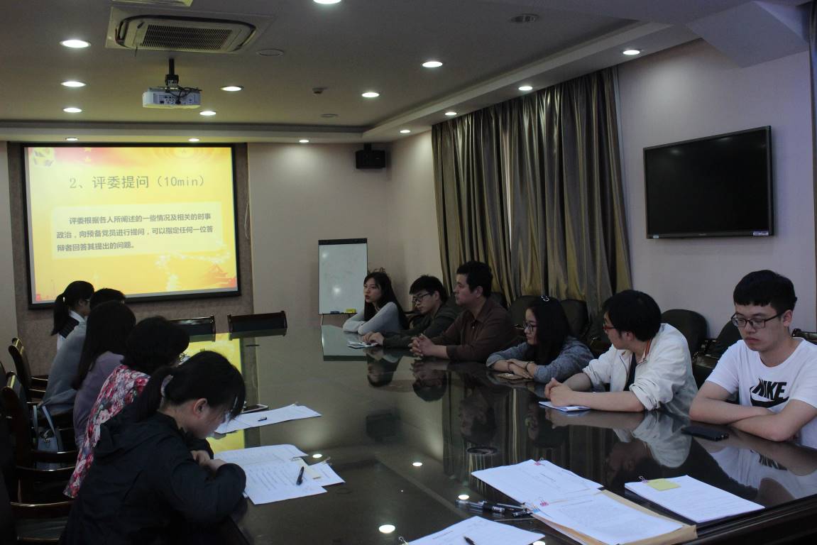 在评委提问环节,评委就如何持续推进“两学一做”和习近平治国理政思想方面进行提问,帮助预备党员更好地认识自己,明确党员义务,争做合格党员。为了进一步考察答辩同学的综合素质,答辩采用了富有特色的“无领导小组讨论”环节,要求各位同学根据观看的视频内容,代入角色进行小组讨论并汇报。无领导小组讨论的主题开放而极具时代特点,包括一带一路、依法治国、懒政问题等等,预备党员展开了积极而热烈的讨论。 大家经过讨论一致认为,作为一名共产党员,一定要勇于承担社会责任,并要将社会责任与自己的职业规划相结合,真正为国家做出实在的贡献。王郁同学说,作为一个党员,在日常生活中,要以“四讲四有”为标准;要积极承担责任,不仅要认真完成上级布置的任务,更要主动联系群众、做好工作。