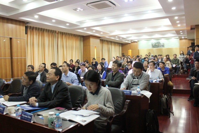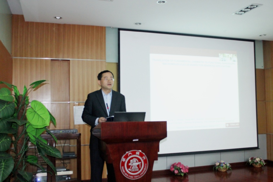 研讨会上半程由丁蓓老师主持。Wooley教授做了题为《基础化学向功能纳米高分子的转化——以先进应用为目的》的开场报告,介绍了基于定向应用的功能高分子材料制备中所使用的合成方法的进展。随后,社团学姐漫画 邱惠斌老师、电子信息与电气学院宋杰老师就各自的研究领域做了展示。
