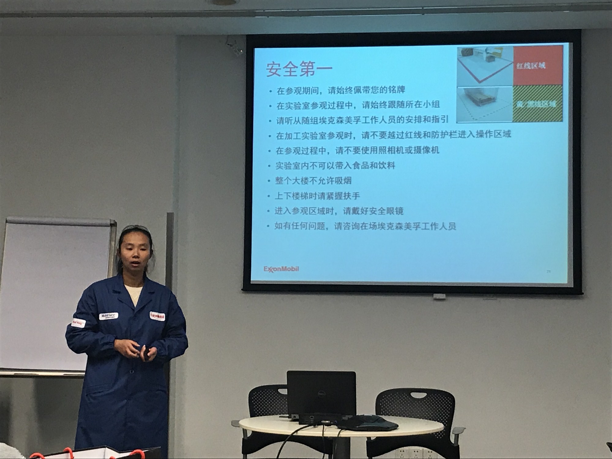 实验室和楼道上随处可见安全警示标志,这也让同学们感受到了埃克森美孚对员工安全的重视。