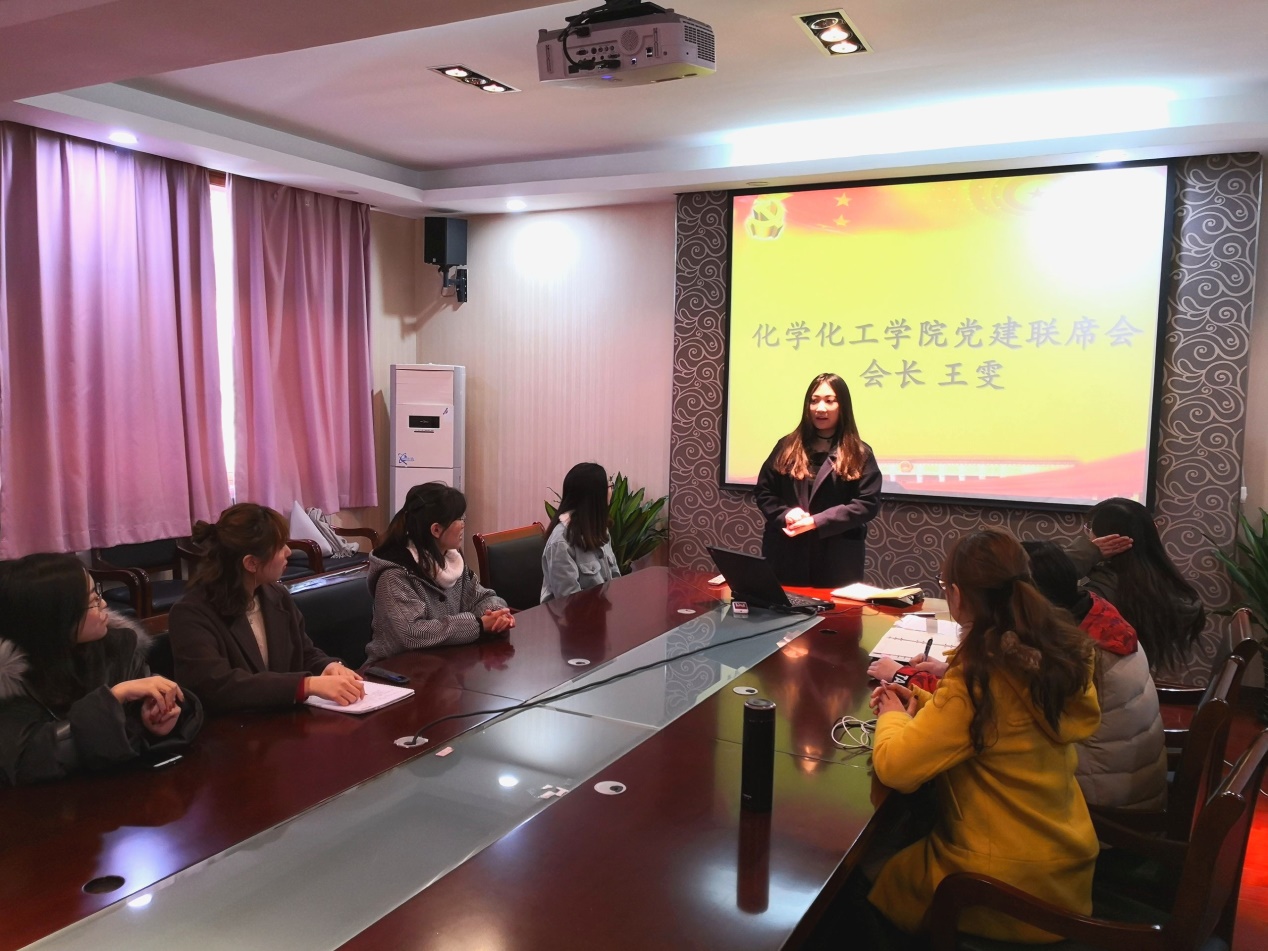 前任会长王雯发言介绍了党建研究会(即原党建联席会)在过去两年中开展的党建工作和系列活动,并表示化院学生党建工作在过去工作扎实,成绩突出。党建联席会的成员们践行了“能担当,做实事,塑形象”的承诺,引导同学们进一步端正入党动机,坚定理想信念,做合格党员。