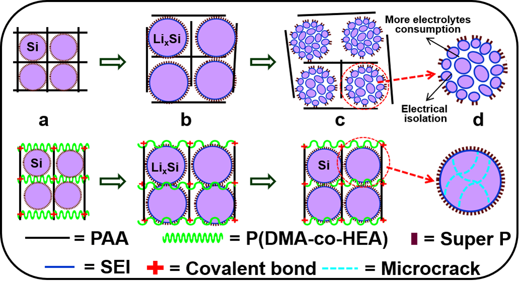 近日,社团学姐漫画 杨军教授研究团队在Cell Press旗下的能源领域新刊Joule发表了题为“Silicon Microparticle Anodes with Self-Healing Multiple Network Binder”的文章,文中所设计的多级网络结构并带有自愈合功能的水系粘结剂(PAA-P(HEA-co-DMA))可以有效缓解微米硅电极在充放电过程中由于活性物质的体积变化引起的颗粒粉化和电子导电缺失现象,进而获得性能优异的硅基负极。