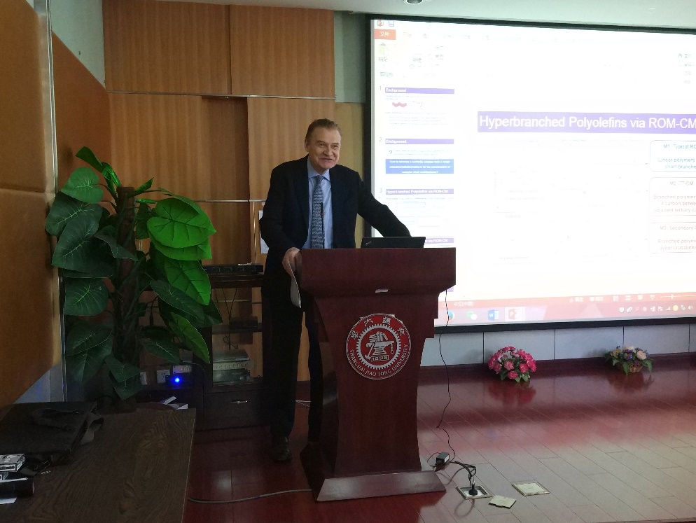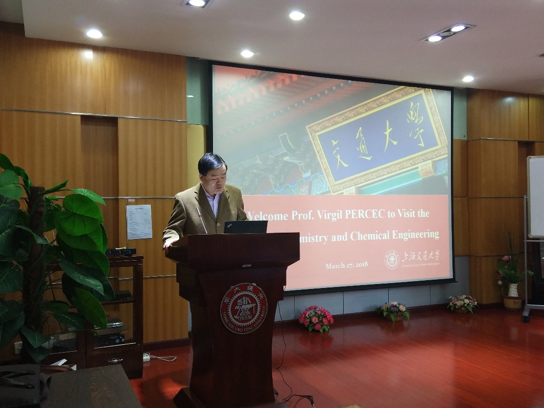 朱新远院长向Percec教授致欢迎词。他简要介绍了Percec教授的教育工作经历和学术成就,希望此次讲座作为化院90周年院庆系列活动,能为在座各位师生带来启迪与收获。