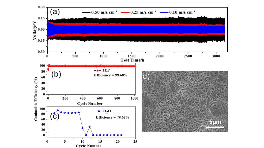 王久林研究员团队首次提出一种磷酸三乙酯(TEP)为溶剂的电解液能够有效的改善金属锌的沉积溶出行为。具体表现为金属锌的沉积为高度规整的多孔形貌,原位形成的多孔结构能够有效地降低真实电流密度和加快锌离子的运输,使得锌对称电池寿命超过3000小时。此外,金属锌的沉积溶出在稳定1000圈之后仍保持效率为99.68%,相比于水系电解液展现出极高的可逆性。与六氰合铁酸钾铜(KCuHCf)正极匹配,锌金属电池表现出长的循环寿命。同时,TEP作为常规的阻燃剂,安全性高。本工作对于制备长寿命和本征安全的锌离子电池具有重大的意义。