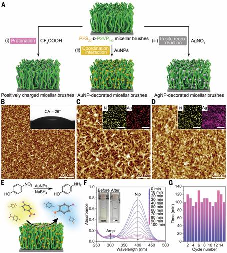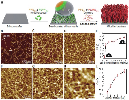 研究人员以硅片作为模型材料,将聚二茂铁硅烷-b-聚(2-乙烯基吡啶)(PFS-b-P2VP)短柱状胶束种子通过非共价键作用锚定在其表面;后续加入的聚二茂铁硅烷-b-聚二甲基硅氧烷(PFS-b-PDMS)能够在胶束种子两端外延生长,最终形成长度均一可控的PFS-b-PDMS柱状胶束刷(图1A)。相比于直接将柱状胶束滴涂在材料表面,活性生长的胶束刷在表面上排列更加致密,而且能够舒展地延伸到溶液中,形成类似于水草丛的阵列结构。通过调节初始种子的负载密度与后续PFS-b-PDMS的投量,还可以精准控制这些胶束刷的密度(图1B-D)和长度(图1F-H),从而精确调节材料表面的亲疏水性(图1E和I)。 PFS-b-PDMS胶束刷较为柔软,干燥后即刻坍塌,为解决这一问题,研究人员进一步制备了更加刚硬的PFS-b-P2VP胶束刷,该类胶束刷在干燥之后仍能维持较好的竖直结构。此外,尤为重要的是,P2VP壳层中的吡啶基团为后续功能化提供了一个良好的平台(图2A),例如可以通过质子化来实现超亲水性(图 2B),或通过配位作用吸附金纳米颗粒(图2C)。相比于聚合物刷,具有微纳米结构的胶束刷不但进一步提升了材料表面功能层的表面积,而且极大地拓展了功能层向外延伸的空间维度,从而展现出更为优异的性能,例如,修饰有金纳米粒子的胶束刷表现出高效且持久的催化能力(图2E-G)。此外,具有还原活性的PFS核还能用于还原银离子,由此制备以PFS-b-P2VP胶束刷为模板的银纳米颗粒阵列(图2D),形成具有抑菌功效的杂化功能层。 基于配位作用、共价键连接等不同的晶种锚定策略,胶束刷可以生长于众多宏观材料表面。此外,这样的胶束刷构建策略同样适用于超薄二维材料,例如可在氧化石墨烯上生长胶束刷,从而形成毛皮状的超薄二维复合材料,经层压并质子化处理后可以制得带有正电荷的纳米薄膜,这类薄膜对于油水乳液和纳米颗粒水溶液表现出极高的分离能力。这一工作提供了一种通用的、自下而上的构筑软物质纳米刷的表面功能化策略,有望在催化、抑菌、分离、能源、传感等诸多领域展现出更为广阔的应用潜力。 撰稿:蔡建东