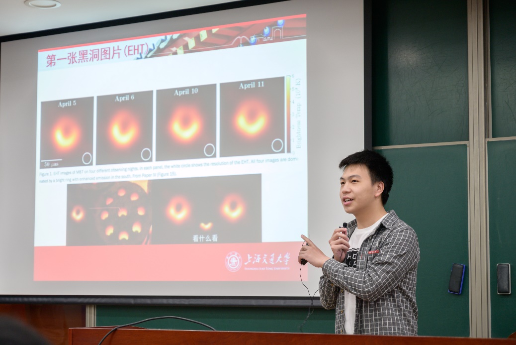 王乔炜简要的介绍活动流程,及其活动中的安全注意事项,活动正式开始。物理与天文学院博士生徐坤带来《神秘的宇宙——黑洞与暗物质》科普报告,他邀请小朋友上台模拟氢原子核聚变的过程,并且讲述了太阳与恒星中氢原子的燃烧。之后他用通俗易懂的语言,给在座的小朋友们讲解了关于黑洞和暗物质的相关知识,拉近了小朋友们与宇宙的距离,让他们对无垠的宇宙有了更多的了解。