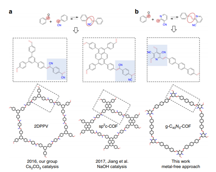 石墨烯作为一种明星材料,近年来在世界范围内受到了来自多个领域学者的持续高度关注,但理论上石墨烯是一种零带隙类金属材料,难以在半导体领域发挥作用。从合理设计并制备有机小分子功能单体或砌块出发,结合有效的聚合方法,制备各类线型或树枝状有机共轭寡聚体和聚合物半导体材料,并精准调控其带隙和能级,业已成为有机半导体材料领域的通用策略。如何充分发挥丰富的有机合成手段,通过“自下而上”法,在溶液中可控构建石墨烯类似物、获得带隙可调的二维有机半导体材料,是一项极富挑战性的课题。共价有机框架(COFs)材料是由有机芳香小分子单体通过可逆动态共价键连接而成、具有长程有序结构的晶态有机多孔材料,也被认为是一种多孔的石墨烯类似物,由于连接COFs网络结构的动态共价键通常是亚胺或者硼酸酯等一系列不稳定且-电子离域性差的化学键,导致此类材料在半导体相关的应用上并未有突出表现。按教课书说法,形成碳-碳键被认为是不可逆过程(笔者认为:是在常规条件下),因此,虽然其广泛用来构筑众多有机染料分子和有机半导体材料,但作为连接基团形成晶态聚合物并未引起重视。社团学姐漫画