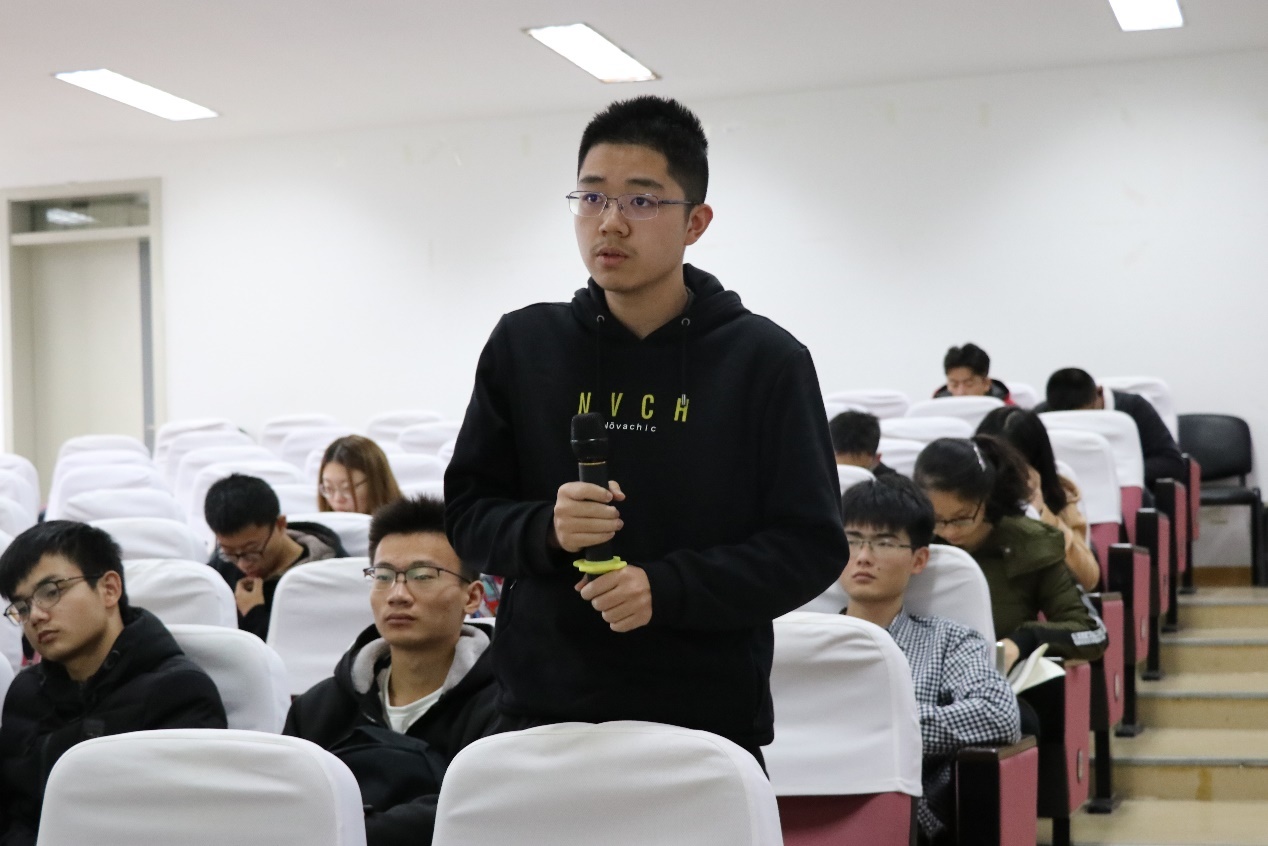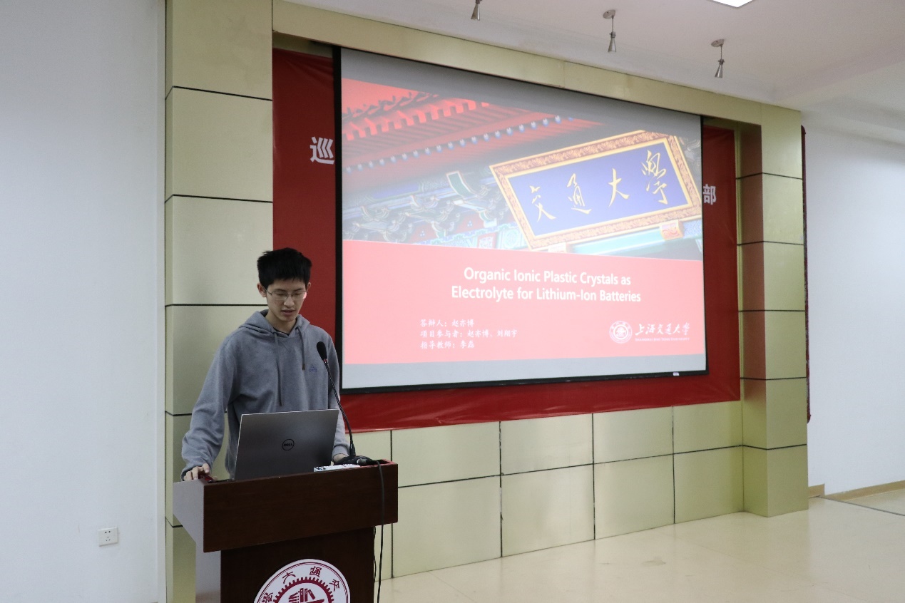 第一组进入汇报,由张振同学介绍项目——“基于超氧化锂的锂空气电池”, 张振同学详细介绍了自己课题组对锂电池的研究和项目获得的成就。汇报结束后,钱雪峰院长、张怡凡老师和尹屹梅老师对张振同学的项目提出宝贵的建议。