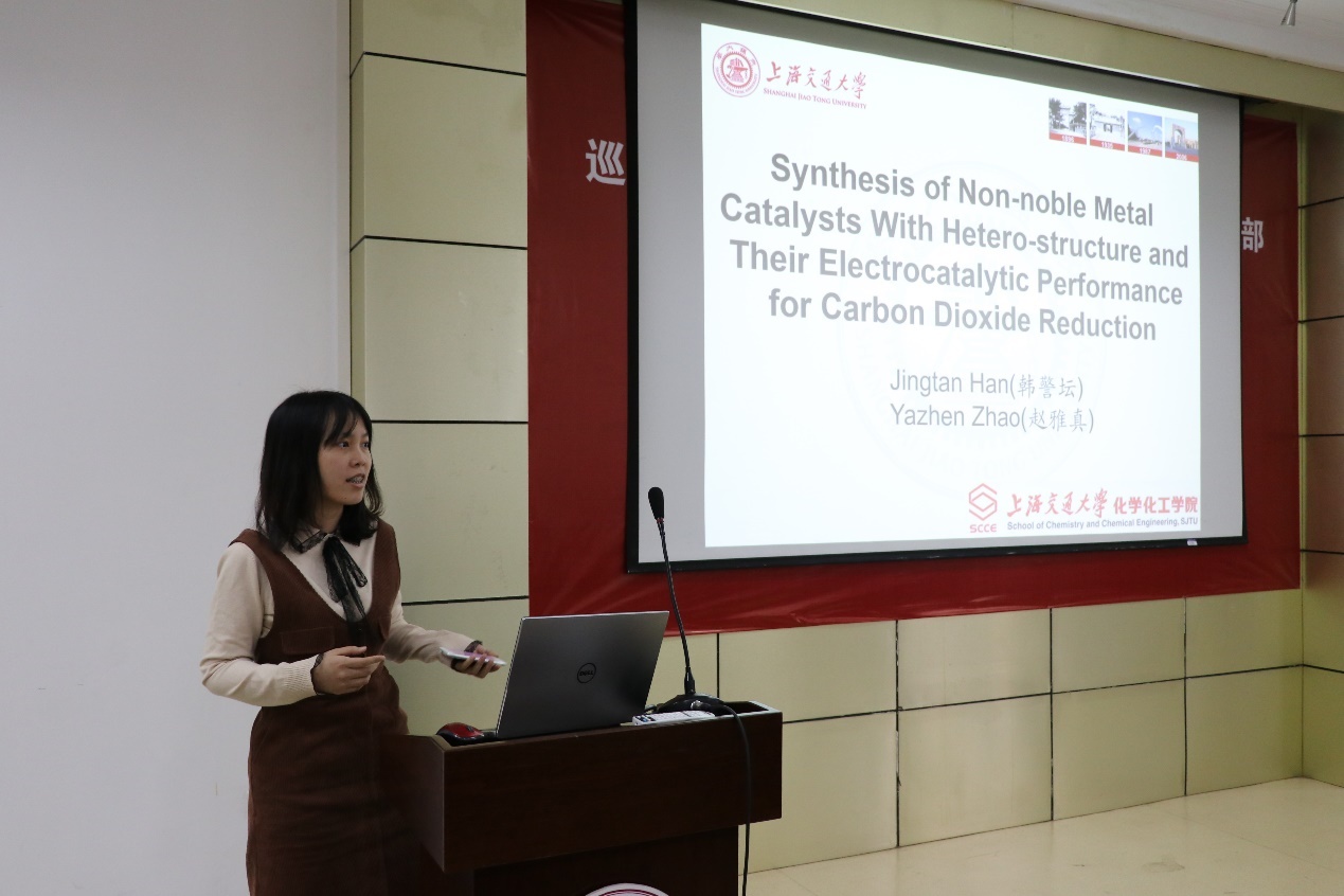 第三组进入汇报,由赵雅真同学介绍项目——“非贵金属异质结催化剂的制备及其电催化还原二氧化碳性能研究”,赵雅真同学介绍了实验的研究目的和项目的具体经过,并介绍了项目的成果。汇报结束后,孟庆华老师、汪羽翎老师、钱雪峰院长和尹屹梅老师就实验的具体成果提出问题,指出实验的不足并提出宝贵建议。