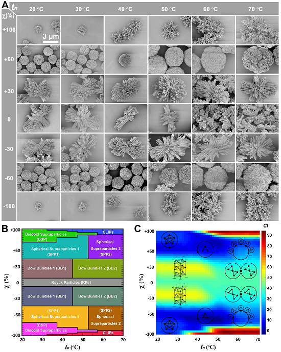 通过调节配体Cys的对映体过量χ,以及改变组装初始时的成核温度tn,作者们制备了一系列不同结构的胶体粒子,并由此绘制了χ―tn的二维形貌相图。这些相图中包含的丰富的相区,为进一步研究组装机理提供了素材。结果显示,当组装基元纳米片表面的静电斥力与纳米片之间的近程耦合力相当,静电约束与材料弹性约束对ΔG贡献相当时,纳米粒子的组装不再依赖于组装基元的尺寸,而更加依赖于它们形状的手性/不对称性。复杂有序结构合成的关键,就是组装过程并非由某一种作用力主导的。各种作用之间的相互竞争、制约,使得组装结构在这些作用之间寻求平衡,从而出现了复杂多级的变化。通过发展数学图论和建立复杂度因子(CI)的算法,将纳米材料的结构抽象成图然后计算CI值,从而实现不同结构复杂度的定量比较。结果显示,这些Au-Cys胶体粒子在高χ值时的形貌最复杂(χ → ±100%),并且复杂度超越了自然界中存在的一些复杂结构,比如颗石藻外壳。