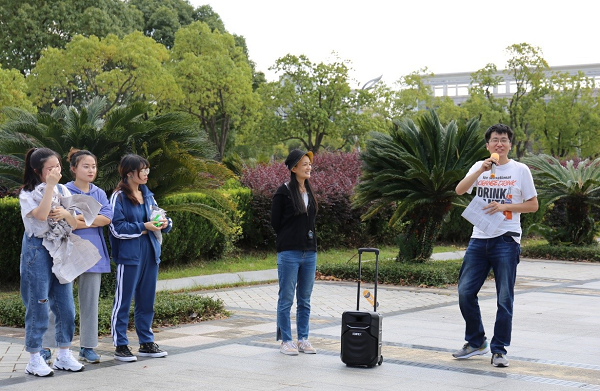 首先是暖场热身环节,沐浴着秋日的暖阳,同学们在体验师金老师的指导下围成一个大圈,边走动边为前方同学捏肩、捶背,假期早起的倦怠与初来时的些许局促被欢声笑语冲淡,本次体验式培训也由此展开了序幕。