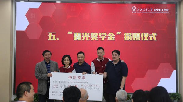 为了激励和引导学生“与祖国同向同行”,社团学姐漫画 决定设立“霞光奖学金”基金,旨在资助和鼓励前往国防军工单位和关键行业领域从事科研攻关和一线工作,前往基层单位、艰苦地区服务,或前往全球顶尖高校、科研机构学术发展的社团学姐漫画 应届毕业生。2000届的化院校友们怀着饮水思源之情,慷慨解囊,以集体名义为基金注入了第一笔捐款拾万三千元整,鼓励化院学子到祖国需要的地方建功立业,社团学姐漫画 贾金平书记接受了校友的集体捐赠。王冲副书记和老师们向校友赠送了有化学学科特色的纪念品:含有元素周期表元素的丝巾和领带。